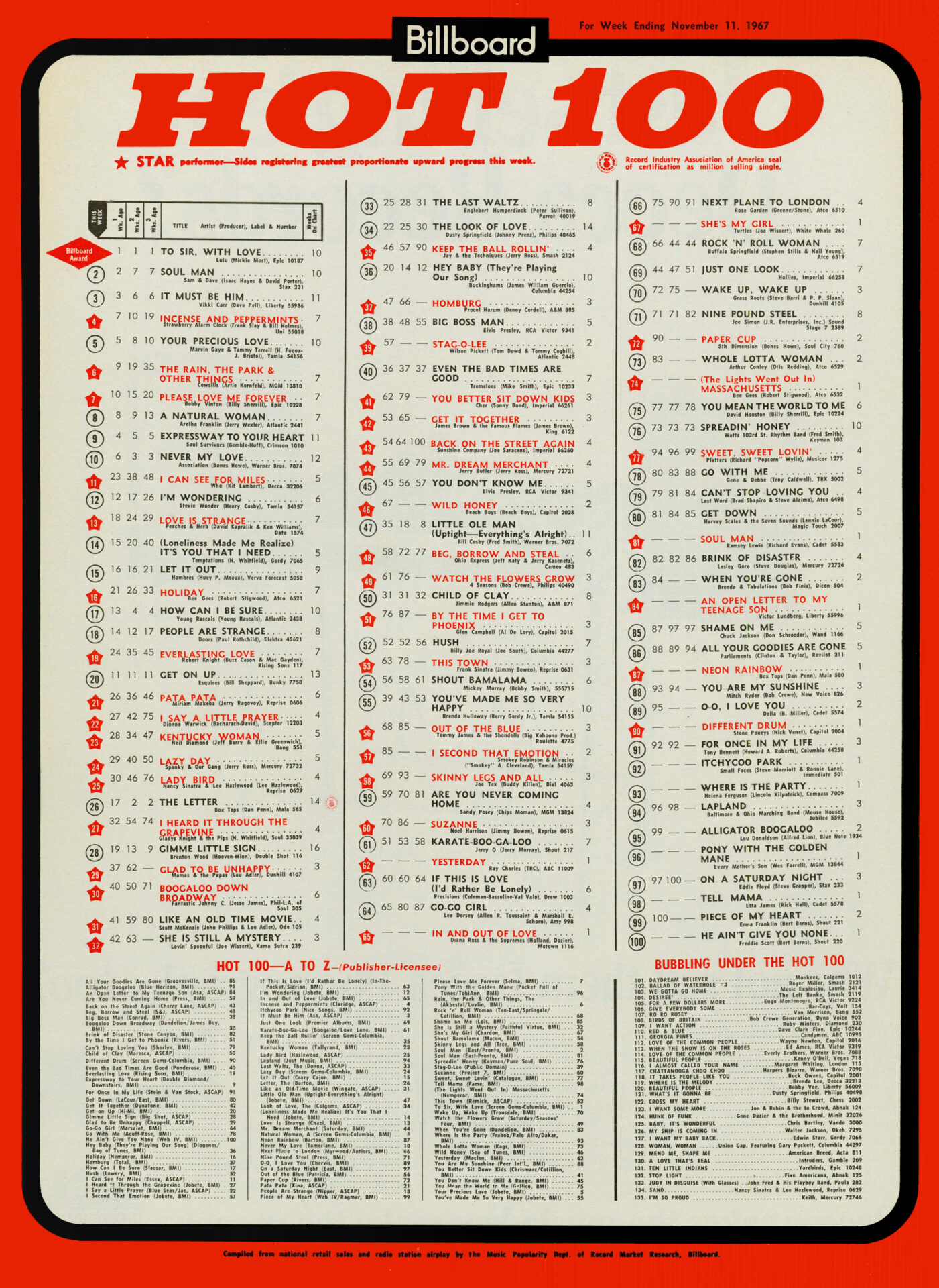 Compiled by the Music Popularity Chart Dept. of Billboard, from national retail store and one-stop sales reports, and radio airplay reports.