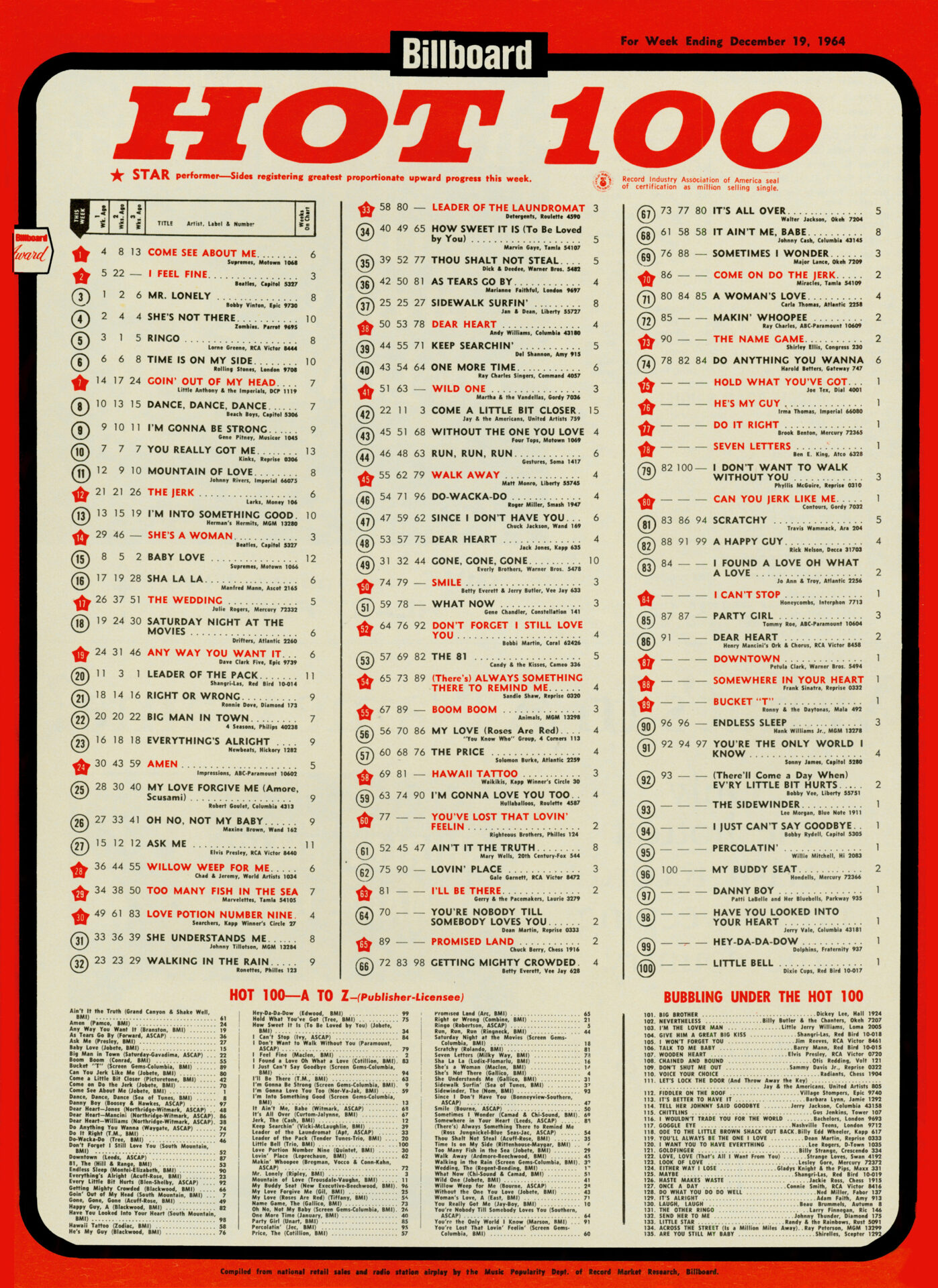 ON YOUR PC? To fully appreciate this Billboard Hot 100 (week-ending) December 19, 1964 chart feature click on image 2x and open to second window. Click image anytime to return to NORMAL image size.