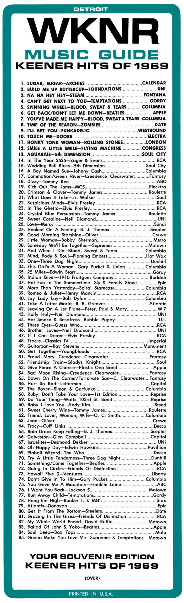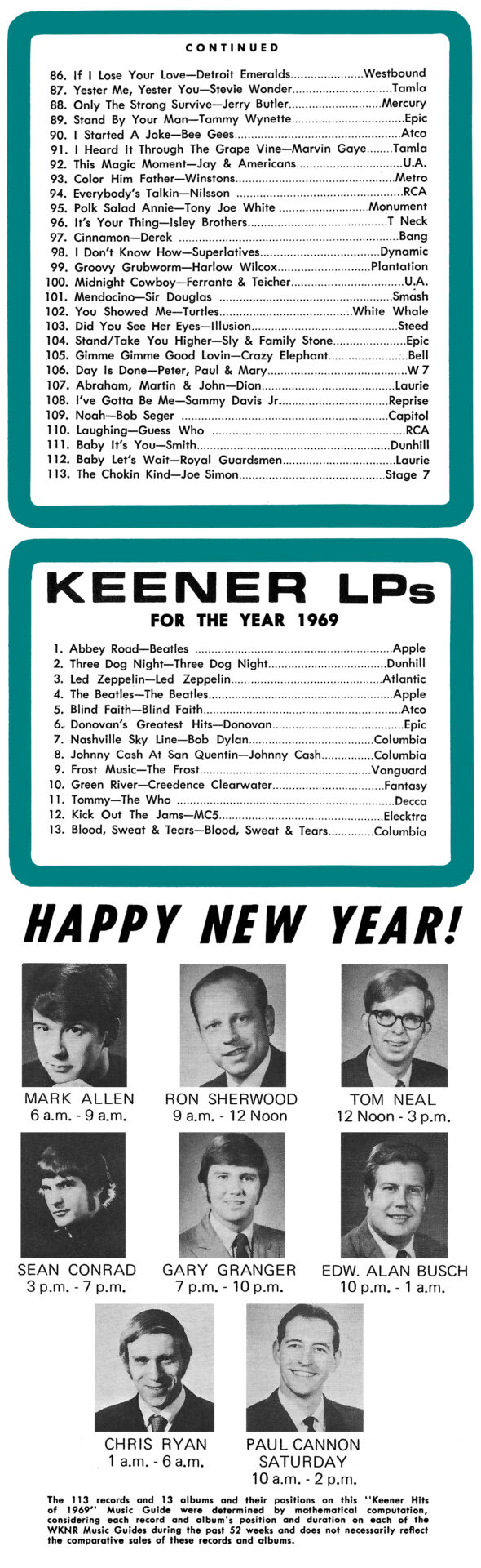 The 113 records and 13 albums and their positions on this “Keener Hits of 1969” Music Guide were determined by mathematical computation, considering each record’s and album’s position and duration on each of the WKNR Music Guides during the past 52 weeks and does not necessarily reflect the comparative sales of these records and albums.