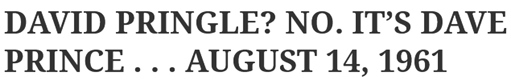 Pringle, who moved from WPAG, Ann Arbor, Mi., to WKMH, Detroit, (in the 7-11:30 p.m. time-slot), August 2, writes: Because of a goof in Billboard, I will be using the air name Dave Prince. They gave me a tag a while back in a misprint and it sounded so much better than Pringle — more adaptable to jingles, etc., that I’ve decided to use it!” END